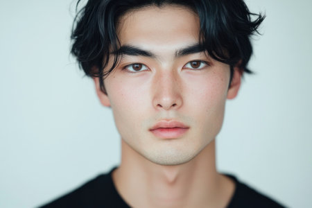 Portrait of young Asian man with dark long hair in traditional clothes looking at camera