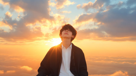 A young Asian woman with short hair looks thoughtfully towards the horizon during a serene sunset, capturing a moment of reflection and peace.