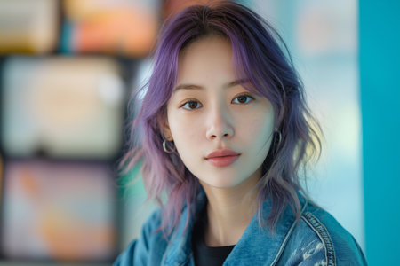 Young woman with lilac and purple hair looks calmly forward wears denim jacket