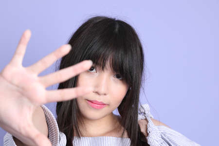 Portrait of a beautiful asian girl with blue wall background.