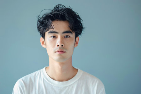 Headshot of a young Asian man with curly hair on a blue background. Casual style studio portrait with copy space. Contemporary urban lifestyle concept for design and advertising