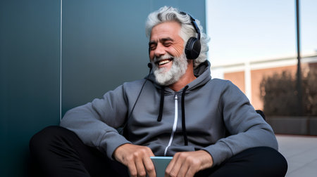 a man with a gray beard listens to music with black headphones