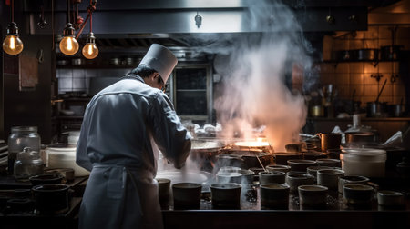 Restaurant Kitchen, Chef Wearing Hat and Cooking Food with Fire and Heat, Generative AI