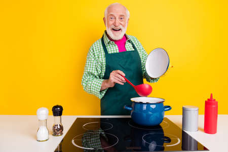 Portrait of attractive cheerful grey-haired man making meal recipe culinary workshop isolated over bright yellow color background