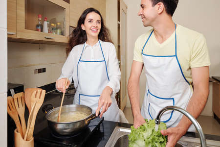 Beautiful happy young woman mixing spaghetti in boiling water when her husband rinsing vegetables for salad