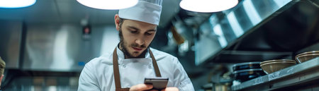 A chef looking up new culinary tools on a smartphone in a busy restaurant kitchen during a break