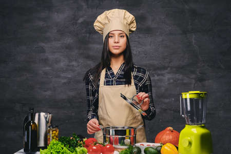 Studio portrait of chef female cook at the table with a lot of vegetables.