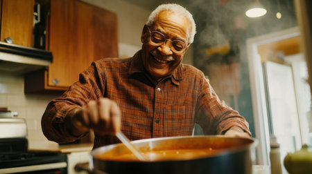 Senior man cooking in the kitchen, smiling as he stirs a pot of soup.