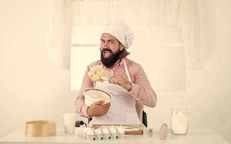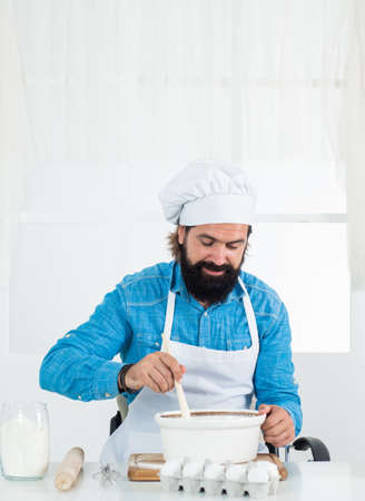 Professional cookery concept. Man with beard holds rolling pin