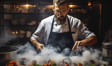 bearded male chef with saucepan in hands kitchen restaurant professional