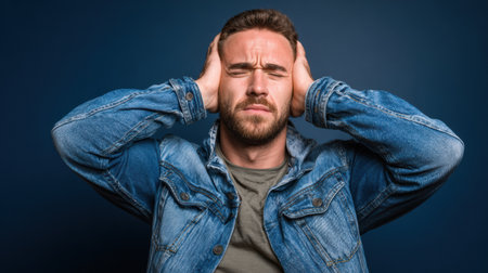 Handsome middle-aged man with salt pepper hair dressed with sports shirt is plugging his ears with fingers to not hear noise or words: he seems very disturbed