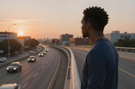 Side view of young african american man looking away while standing on highway at sunset