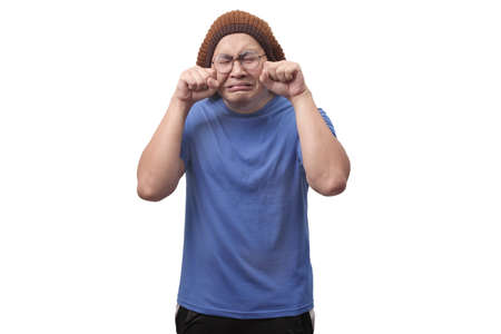 Photo image of funny Asian man crying close his eyes, sad depression frustration hopeless expression