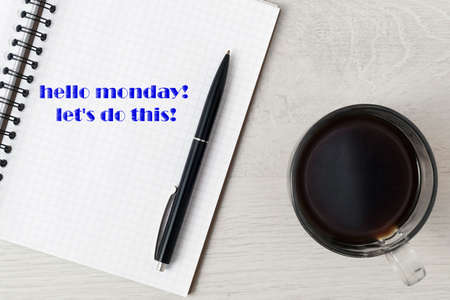Hello Monday, start your week with good mood. Cup of freshly brewed aromatic coffee on white marble table, top view