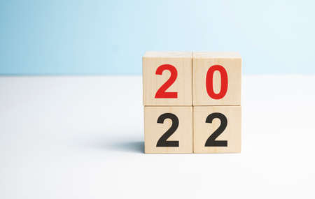woodblocks cubes with a number 2021 change to 2022 blue background. new year 2021-2022 concept.
