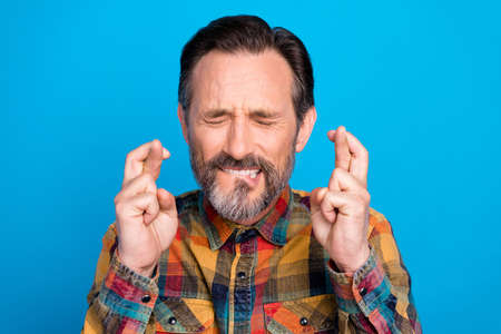 Photo of beg brunet hairdo age man crossed fingers wear plaid shirt isolated on blue color background