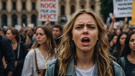 Passionate Woman Yelling at Rally Surrounded by Supporters in Urban Setting.