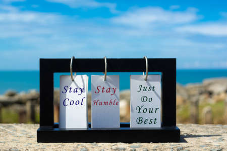 Motivational and inspirational quote with blurred background of ocean - Stay cool stay humble just do your best