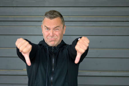 Portrait of a middle-aged man showing a double thumb down sign with both hands as a symbol of dislike and disapproval