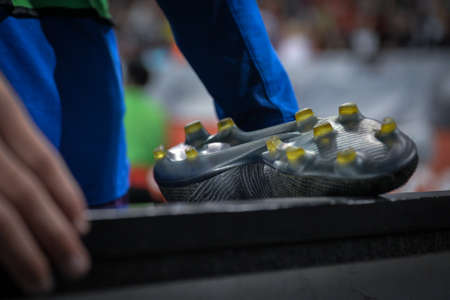 Kyiv, Ukraine - August 17, 2019 soccer ball with his feet on the football field
