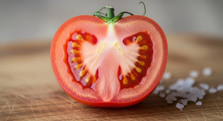 Ripe red tomato, sliced in half, showcasing its vibrant red flesh, glistening seeds, and juicy pulp. placed on a rustic wooden cutting board with coarse salt flakes.