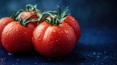 Bright red tomatoes glisten with droplets of water on a dark stone surface, showcasing their freshness. Perfect for culinary visuals, food art, or healthy lifestyle themes.