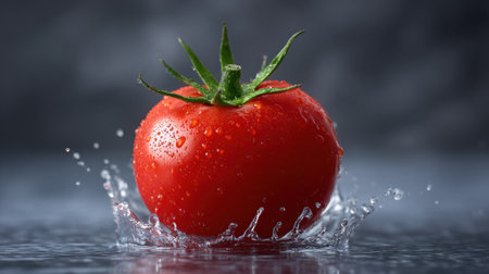 A vibrant red tomato with droplets of water splashing around it against a dark background, showcasing freshness and natural beauty, ideal for food photography.