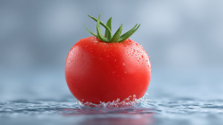 A vibrant red tomato with water droplets rests on a reflective surface, showcasing its freshness and natural beauty. Ideal for culinary themes.
