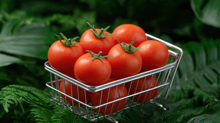 A captivating image featuring fresh red tomatoes arranged in a mini shopping cart, set against a backdrop of lush green foliage, symbolizing healthy eating and vibrant living.