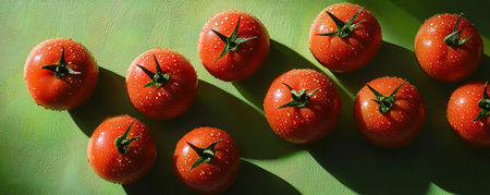 Fresh tomatoes with water droplets on green background, high contrast. Organic food and healthy eating concept