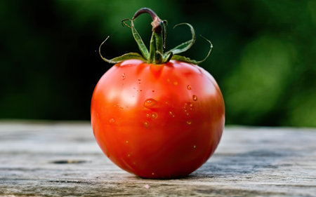 A ripe red tomato with water droplets on a wooden surface with blurred background