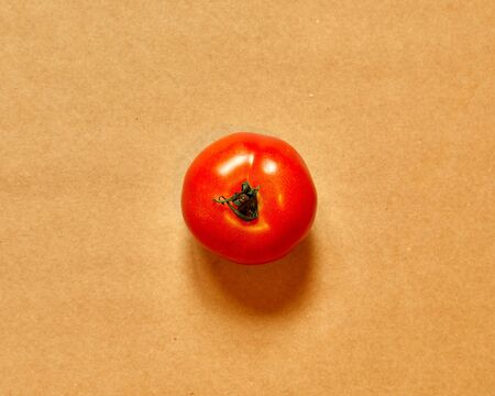Fresh red tomato isolated in brown background viewed from above - flatlay look