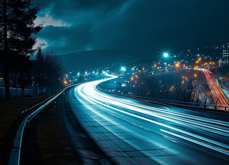 Scenic Winding Highway at Night with Bright Light Rails Creating a Dynamic Journey Experience