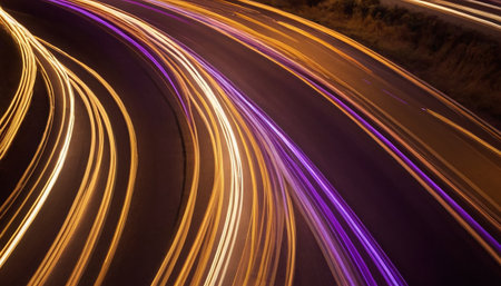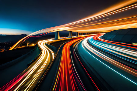 Captivating long exposure photograph capturing vibrant light trails of traffic on an urban highway at night, showcasing movement and energy in city life.