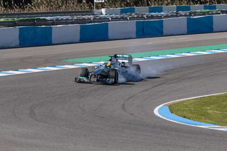 JEREZ DE LA FRONTERA, SPAIN - FEBRUARY 08 Lewis Hamilton of Mercedes AMG Petronas F1 Team locks the wheels on the first Test at Jerez Circuit on February 08, 2013, in Jerez de la Frontera, Spain