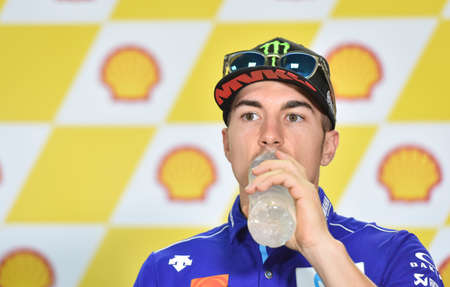 SEPANG, MALAYSIA - NOVEMBER 04, 2018 : Maverick Vinales of Spain and Movistar Yamaha MotoGP speaks during press conference MotoGP of the Malaysian Motorcycle Grand Prix at Sepang International Circuit.