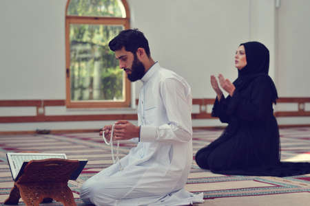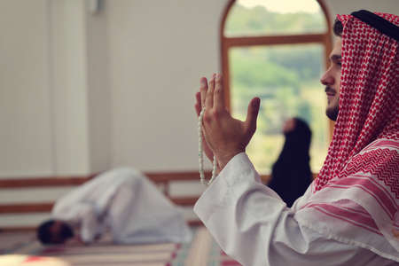 Religious Muslim people praying in the mosque. Ramadan celebration