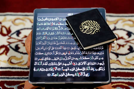 Digital Quran or Quran apps is used for muslim to read the text of Quran on an electronic device. Islamic flatlay concept