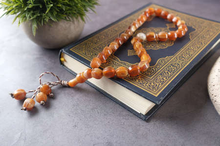 Close up Holy Quran with tasbih or muslim beads rosery over a praying mat. Ramadan Kareem