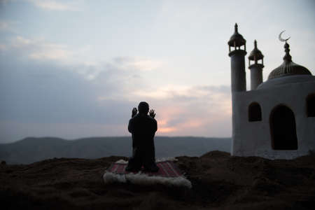 Silhouette of mosque building on sunset. Ramadan Kareem background. Realistic mosque miniature with prayer silhouette. Selective focus