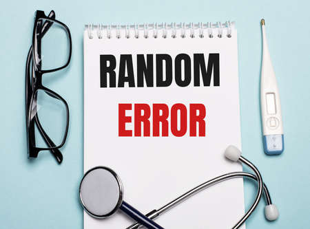 RANDOM ERROR written on a white notepad next to a stethoscope, goggles, and an electronic thermometer on a light blue background. Medical concept.