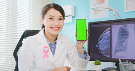 asian female doctor wearing pink ribbon with mammography test results and xray on computer monitor in hospital - she holds green screen mobile phone