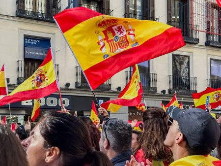 Madrid, Spain - November 12: Protesters at a demonstration against the amnesty for Catalan separatists given by prime-minister Pedro Sanchez, in Puerta de Sol in Madrid, Spain on November 12, 2023