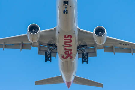 Vienna, Austria - April 4, 2020: Airplane on landing approach on a sunny day in spring, blue sky, sunny day in spring