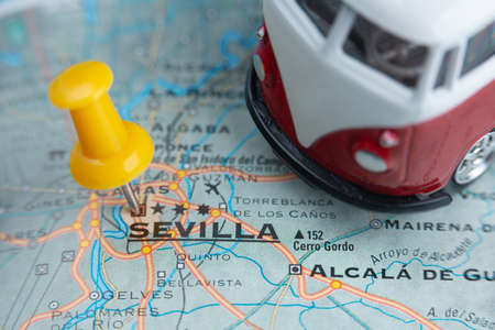Seville Spain July 05, 2021 Bus driving through the streets of Seville, an emblematic city and the capital of the region of Andalusia, in the south of Spain