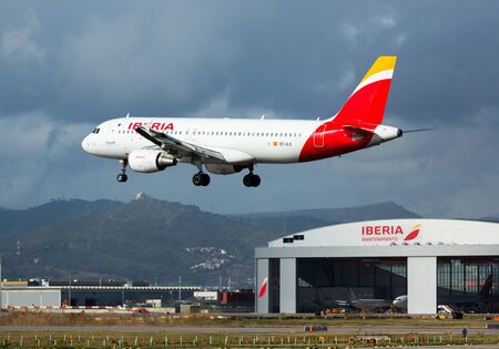 BARCELONA, SPAIN - JANUARY 23, 2020: Iberia airbus A320-214 with EC-ILS registration flying in cloudy sky, approaching landing in Barcelona-El Prat Airport