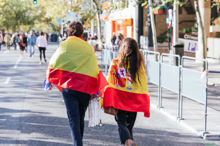 A boy and a girl with the Spanish flag around their necks as if it were a cape during the military parade of the National Day of Spain on October 12 - Madrid