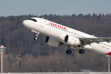 Zurich, Switzerland, February 10, 2022 Iberia Airbus A320-251N airplane is departing from runway 28 at the international airport