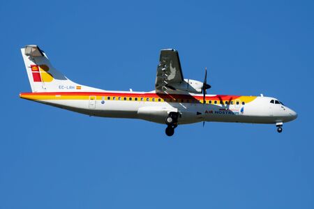 MADRID / SPAIN - MAY 2, 2016: Iberia Regional Air Nostrum ATR-72 EC-LRH passenger plane landing at Madrid Barajas Airport