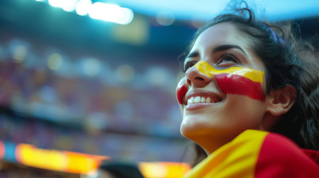 Euphoric spanish fan with flag painted face at stadium, blurry background for text placement